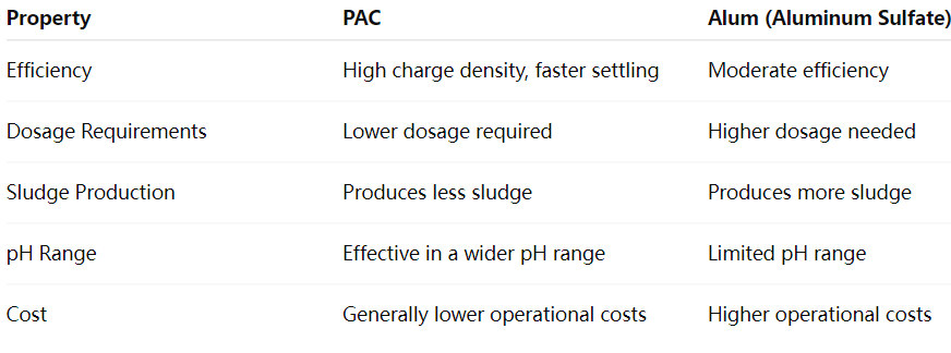 В отличие от традиционных коагулянтов, таких как квасцы (сульфат алюминия), PAC известен своей превосходной эффективностью и более быстрым временем оседания в процессах очистки воды. Он имеет высокую плотность заряда, что делает его особенно эффективным в дестабилизирующих суспендированных частицах и образовании больших хлопьев, которые затем можно удалить путем седиментации или фильтрации.